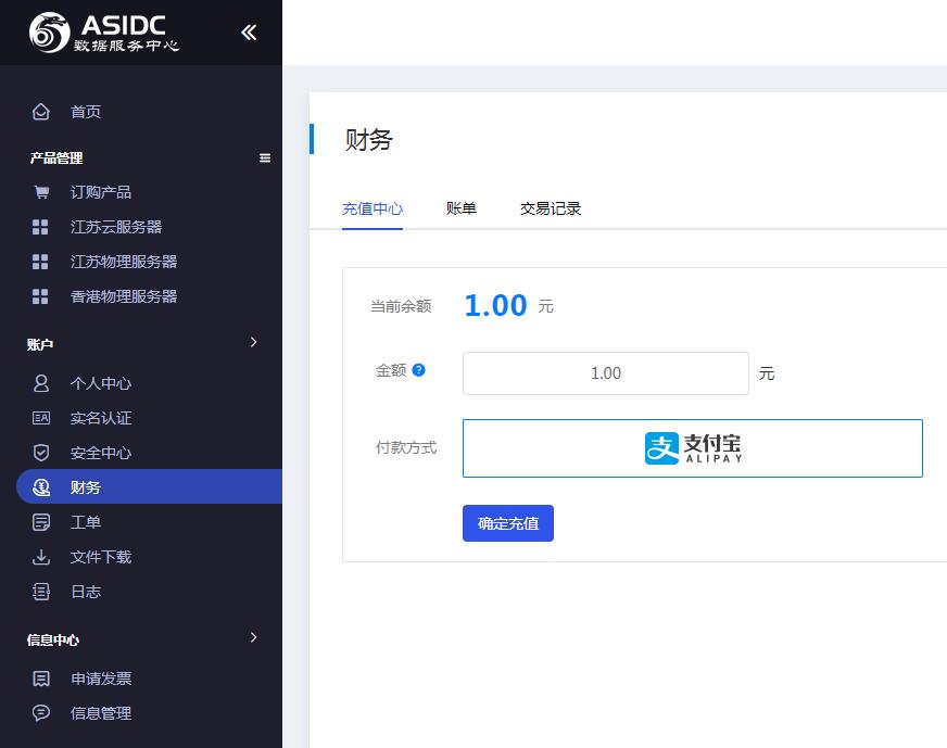 2、选择左侧导航栏-“财务”-“充值中心”,选择支付宝进行充值。
