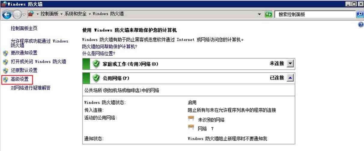 1、打开 控制面板 — 选择 系统和安全-Windows 防火墙,左侧选择 高级设置。