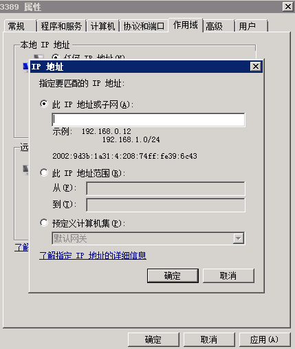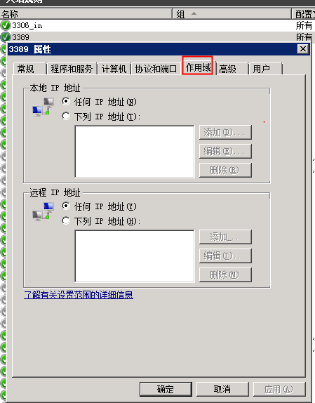3、在 远程IP地址 里选择 下列IP地址 ,点添加 ,根据自己的实际需求把需要允许IP填进去,然后点 确定 ,再点击 应用 ,就完成了操作。