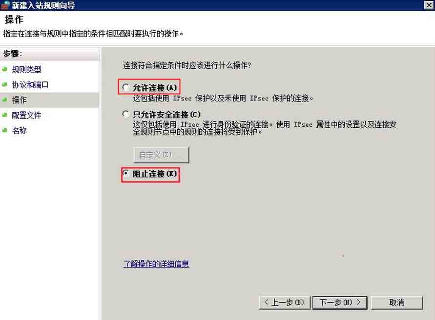 如果入站规则缺省规则是 允许 ,那么选择选择 阻止连接 表示关闭该端口。