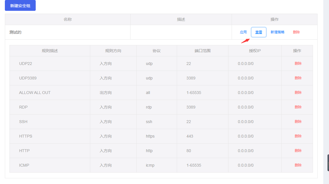 新建完成后,我们点击查看(如下图),可以看到默认的一些端口策略,您可以根据自己的需求删除不需要的端口策略,也可以点击新建策略按钮,新建自己需要的端口策略。