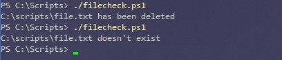 正如你所看到的,脚本第一次运行时,一旦确认文件存在,它就会检查并删除该文件;第二次运行时,它找不到文件,因为它已经被删除了,所以返回 "不存在 "信息。第二次运行时,它找不到文件,因为它已经被删除了,所以返回 "不存在 "的消息。
