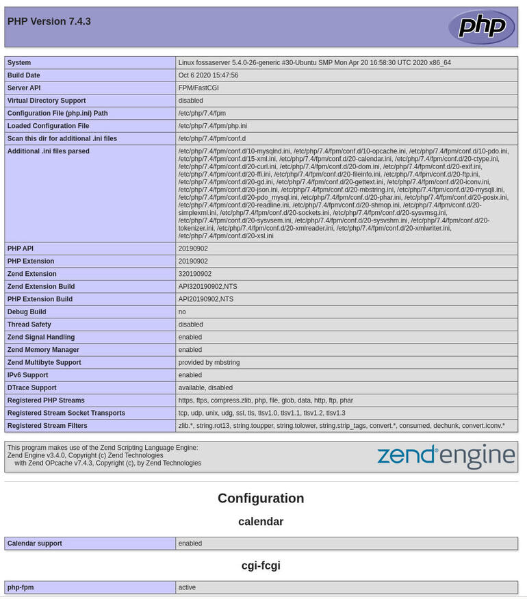 打开网页浏览器并将其指向 http://SERVER/info.php (其中 SERVER 是主机服务器的 IP 地址)。你应该看到,在PHP信息页面的顶部,FPM/FastCGI列出了服务器API,在cgi-fcgi下,php-pm是活动的。