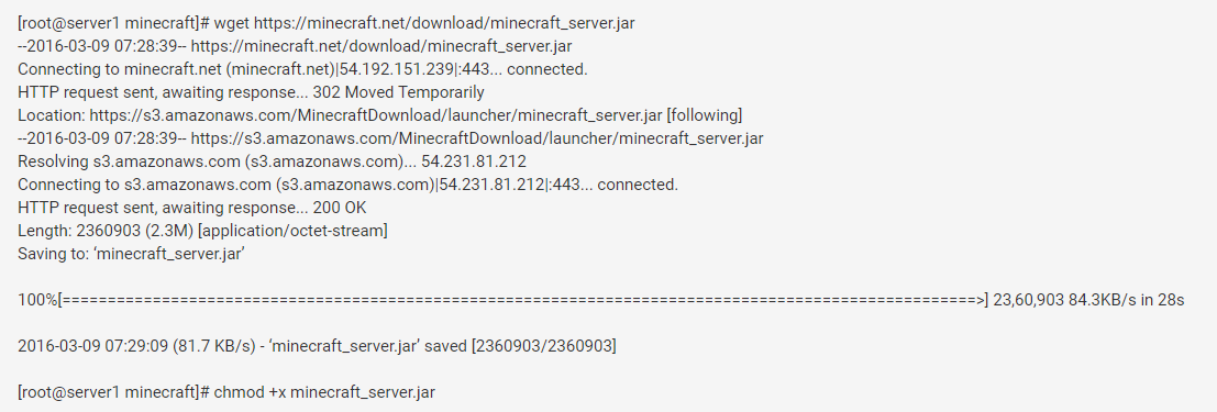 将安装许多软件包。现在,我们需要下载Minecraft服务器软件包到“minecraft”文件夹中。