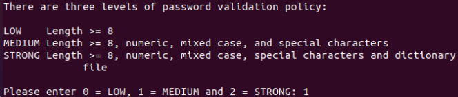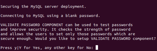 如你所见,命令提示要求你首先选择是否要安装一些缺失的安全组件,例如:VALIDATE PASSWORD。按Y键,然后按Enter键。现在它会询问密码强度级别:建议你选择1或2,即中等或强。