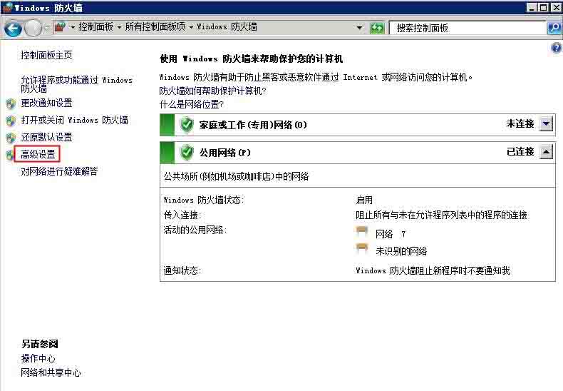 在服务器的控制面板中打开 windows防火墙 ,选择 高级 :