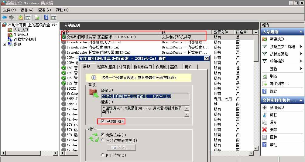 点击 入站规则 ——找到 文件和打印机共享(回显请求 - ICMPv4-In) ,启用此规则即是开启ping,禁用此规则IP将禁止其他客户端ping通,但不影响TCP、UDP等连接。