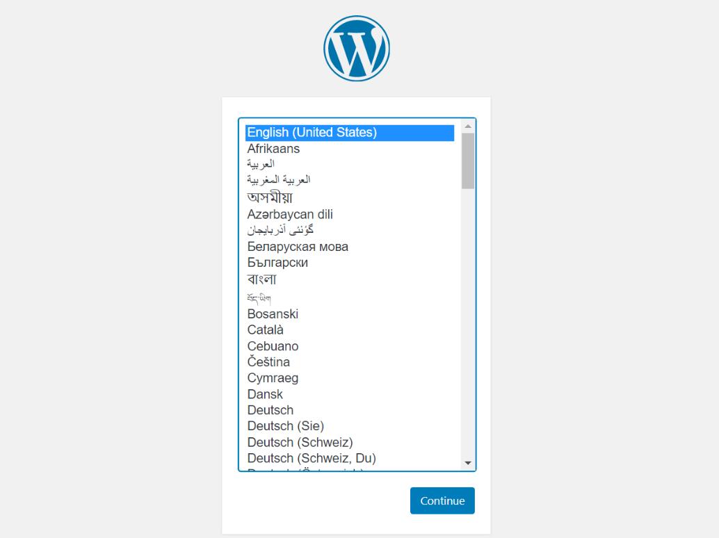 选择您的语言,然后按照安装向导完成WordPress的安装,并创建您的管理账户,安装步骤非常简单。