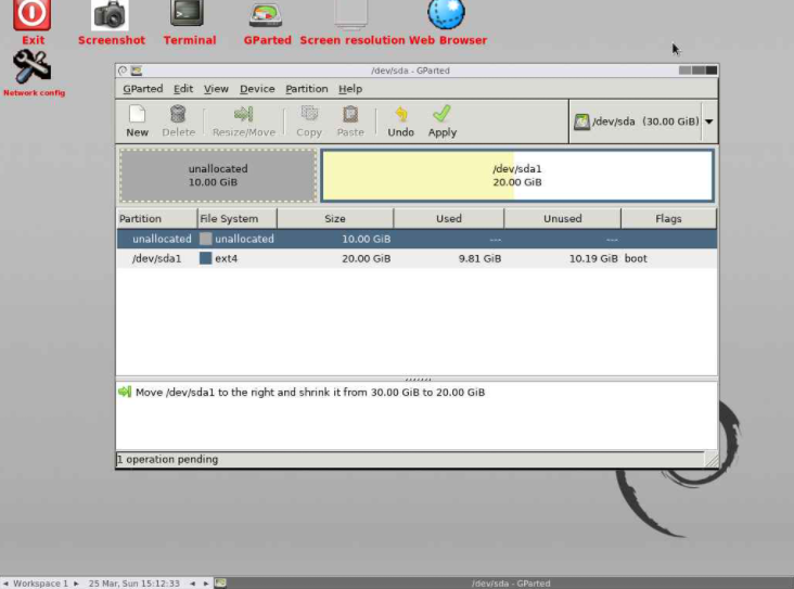 现在,你想从该根分区中创建一个单独的分区用于其他用途。这样的话,你需要调整它的大小。这并不限于根分区,你可以调整系统中任何可用分区的大小。