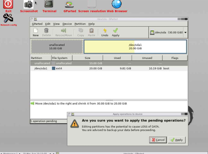 这将提示您确认分区将被调整大小,因为您正在编辑实时系统分区。按"ok"确定按钮继续。