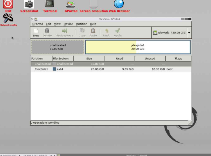 现在,已成功加载GParted实时屏幕,并显示系统中的活动分区: