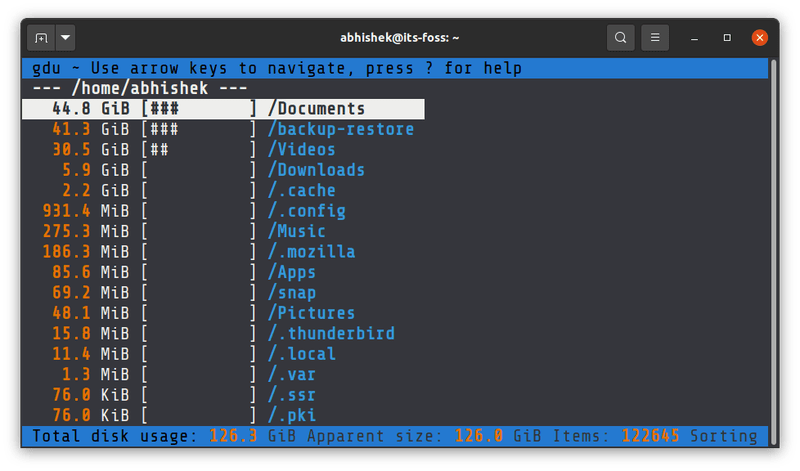 由于它具有终端用户界面(TUI),因此您可以使用箭头浏览目录和磁盘。您还可以按文件名或大小对结果进行排序。
