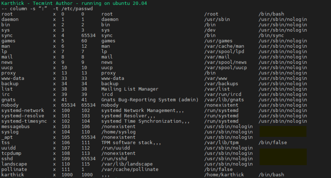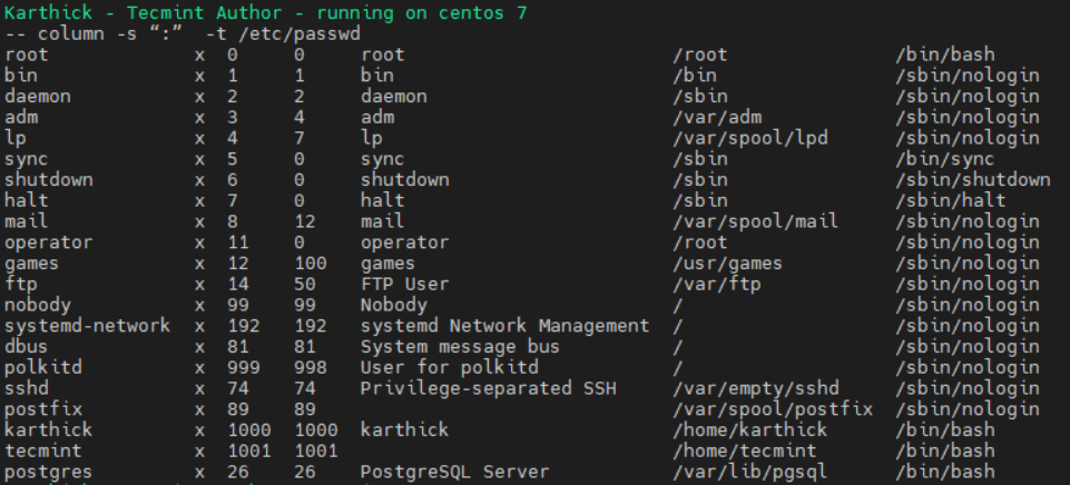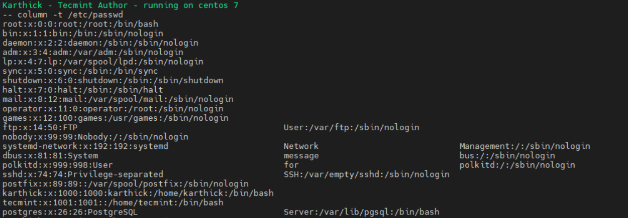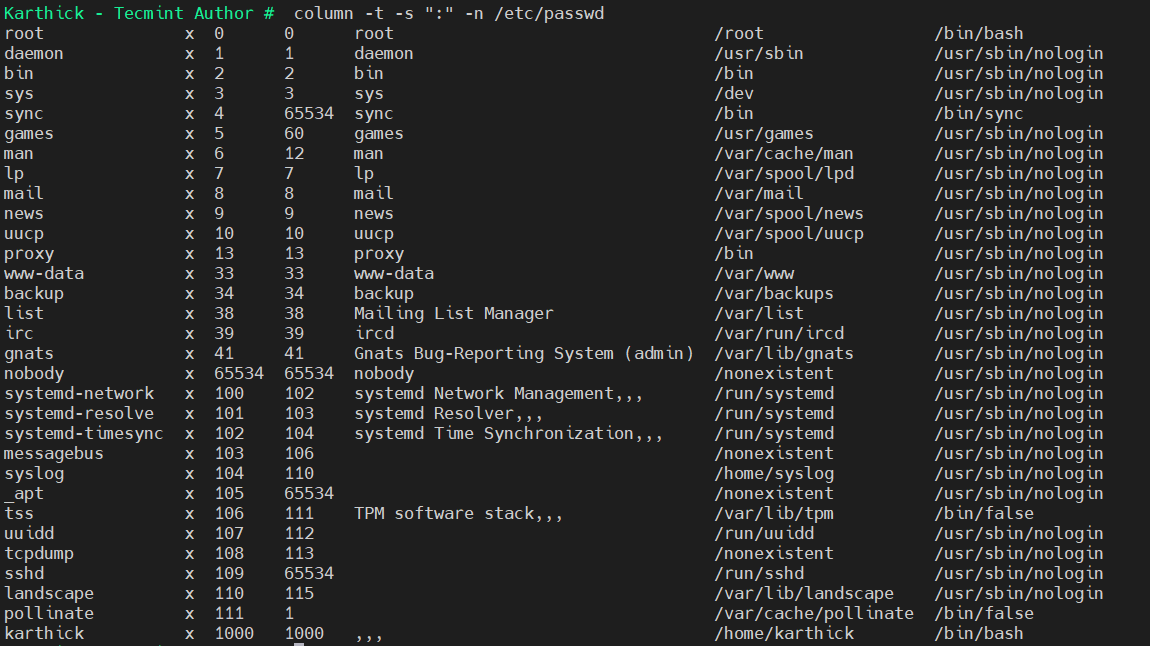 $ column -t -s ":" -n /etc/passwd # Only on Debian/Ubuntu
