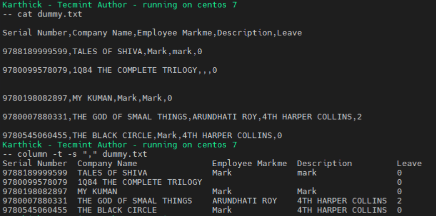 你有没有遇到过要处理CSV文件并以结构化的表格格式输出的情况?最近,我正在对一个结构不合理的文件进行数据清洗。它的每一列之间都有很多空格,我必须将它转换为CSV格式推送到数据库中。在清洗并创建CSV格式的输出后,我的输出并不能直观地验证CSV文件的数据完整性。这个时候,"Column "命令就给我派上了用场。