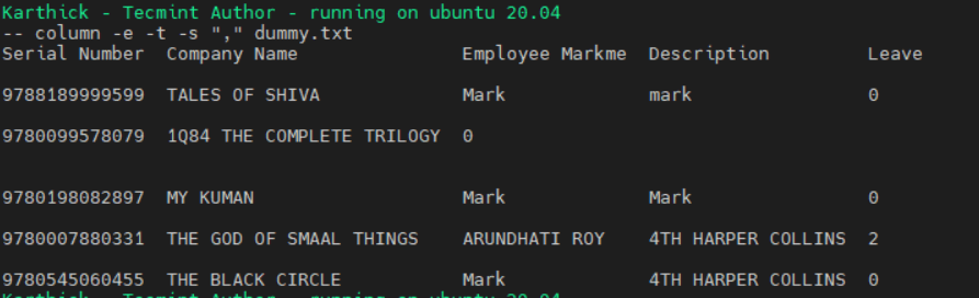 $ column -e -t -s "," dummy.txt # Only on Debian/Ubuntu