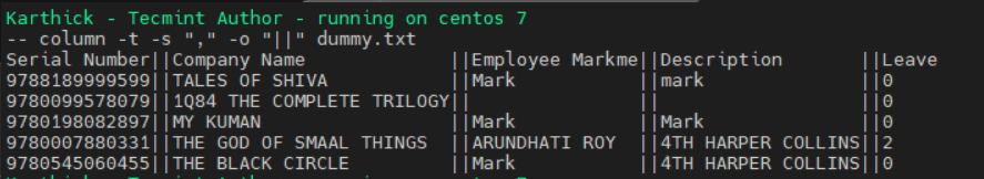 $ column -t -s "," -o "||" dummy.txt # Only on Rhel based distro