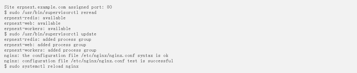 在本节中,我们将安装Supervisor来管理ERPNext进程,并安装Nginx作为反向代理来访问ERPNext,而无需使用端口8000。